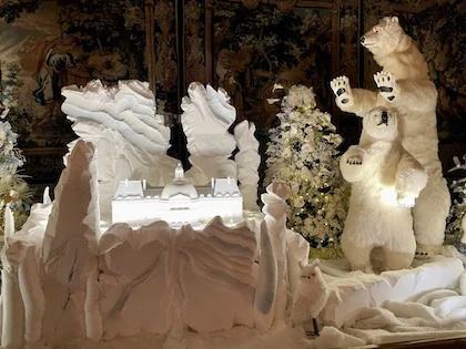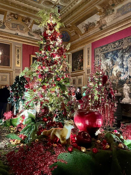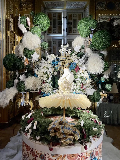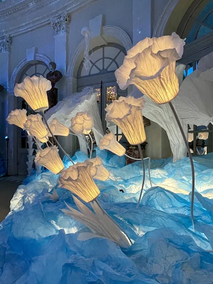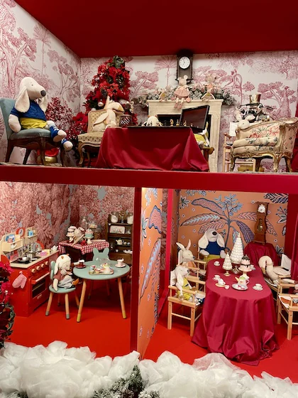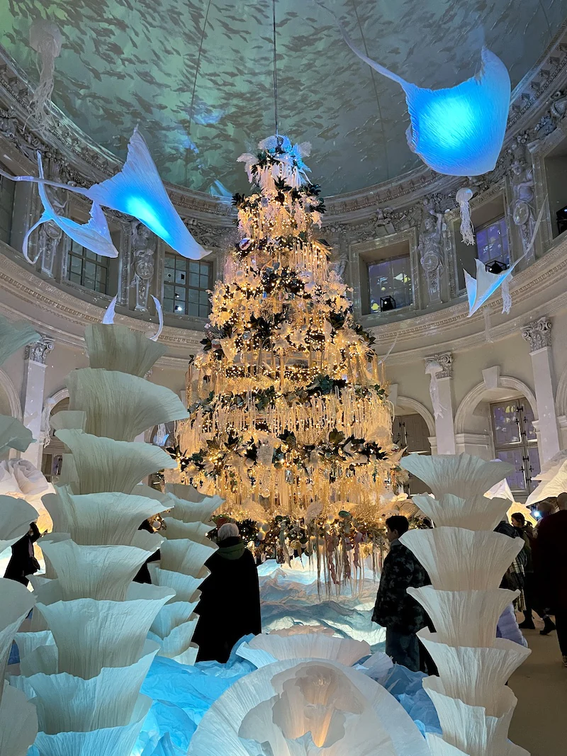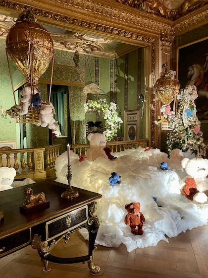 Dans la Chambre Carrée, vous verrez des nounours partis à l'aventure sur un lit volant, entourés de sapins à l'envers... Ensuite, direction le pôle nord dans le salon des Muses, où pingouins et ours polaires animés accueillent les enfants, autour d'une maquette du château qui semble faite de glace. Le temps est figé, le château devient éternel ! Dans le Cabinet des Jeux tournoie un magnifique tutu qui rappelle les boîtes à musique. En passant dans le Salon d'Hercule, on découvre une fabriue de pommes d'amour, peuplée d'animaux. On arrive alors dans le Grand Salon : sous la coupole de plus de 18 mètres de haut, trône un sapin de 7 mètres. Tout autour, se déploie une très belle installation en papier de l'artiste Junior Fritz Jacquet, sculpteur d’océans et maître de l’origami. Il a imaginé un univers onirique et maritime, où le papier se plie, se froisse et se modèle pour donner vie à des paysages sculptés d’une finesse aérienne. Chaque création est entièrement réalisée à la main, et l'ensemble est vraiment réussi ! On est dans un autre monde. En hauteur, où flottent des raies et des méduses, une projection immersive couvre la coupole de poissons. Cap ensuite sur la bibliothèque, transformée en banquet des fées. Juste après, la Chambre du Roi est devenue celle de mignons petits ours qui voyagent sur des nuages et dans des montgolfières ! Et puis arrive la Salle des Buffets, totalement transformée cette année. Elle est occupée par une maison de poupée géante (6 mètres de haut !), peuplée de peluches. Un travail remarquable, qui, comme le Grand Salon, apporte de la fraîcheur et de la modernité. Il ne reste plus qu'à descendre aux cuisines : de délicieuses odeurs vous guident jusqu'à un décor composé de gourmandises, notamment un énorme dromadaire en chocolat, avec en bonus un petit chocolat à grignoter offert. Mais il est déjà temps d'aller se dégourdir les jambes dans le parc !